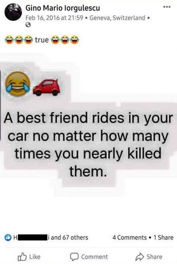 "A best friends rides in your car no matter how many times you nearly killed them - Cel mai bun prieten călătoreşte cu tine cu mașina chiar dacă aproape l-ai omorât'', a scris atunci tânărul, pe pagina sa de Facebook.