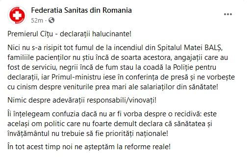 „Premierul Cîțu - declarații halucinante! Nici nu s-a risipit tot fumul de la incendiul din Spitalul Matei Balș, familiile pacienților nu știu încă de soarta acestora, angajații care au fost de serviciu, negri încă de fum, stau la coadă la Poliție pentru declarații, iar Prim-ministrul iese în conferința de presă și ne vorbește cu cinism despre veniturile prea mari ale salariaților din sănătate! Nimic despre adevărații responsabili/vinovați! ”, este mesjul transmis de Federația Sanitas.