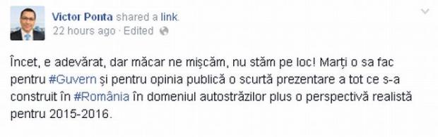 Deşi nu este foarte mulţumit de ritmul în care se lucrează la autostrăzile din Romania, Ponta susţine că "este adevărat că ne mişcăm încet, dar măcar ne mişcam, nu stăm pe loc".
