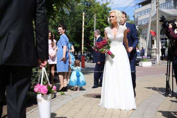 Unimedia.info a publicat mai multe imagini cu mireasa, care poartă o rochie simplă, lungă, cumpărată din România, și soțul ei, Dorin Chirtoacă.