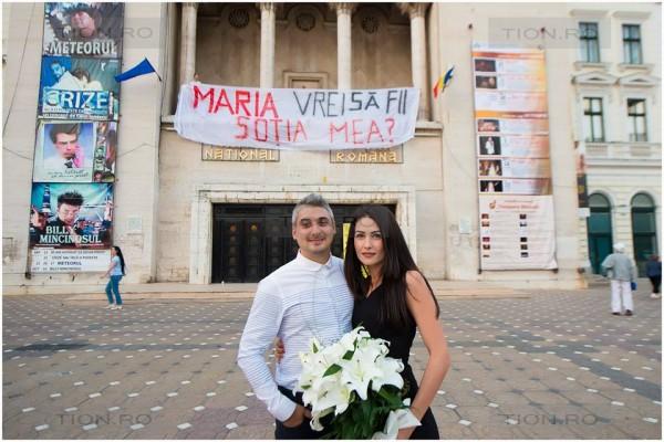 De fapt, totul a început după ce un timișorean a decis să își surprindă iubita și, cu ajutorul unor prieteni, a confecționat un banner imens pe care a scris „Maria vrei să fii soția mea”. Apoi, fără ca tânăra să suspecteze ceva, a chemat-o la o plimbare în centrul Timișoarei, iar, la un moment dat, prietenii lui au desfășurat bannerul agățat de balconul Operei din Timișoara, iar bărbatul s-a pus în genunchi și a cerut mâna celei pe care o iubește. Evident, răspunsul a fost „Da”.
