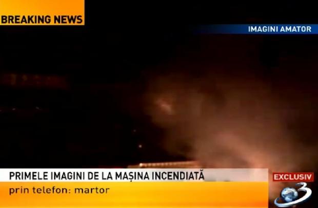 Sursele Antena 3 susţin că maşina distrusă ar aparţine unui angajat al MAI implicat în descinderile recente asupra clanurilor "Cămătarii" şi "Sportivii".