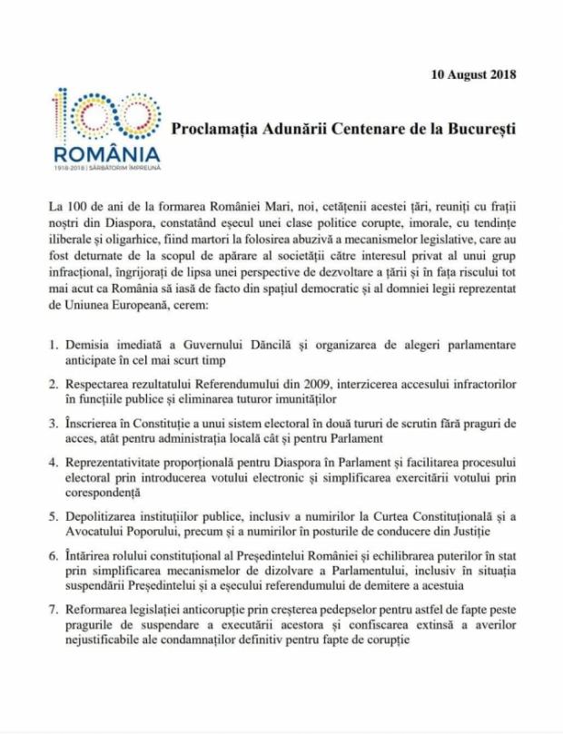 A apărut și o ”proclamație” a protestatarilor din Piața Victoriei, care cer, printre altele, demisia Guvernului și alegeri parlamentare anticipate.