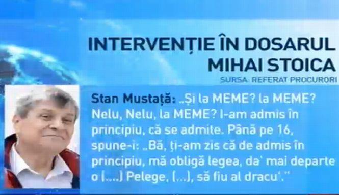 Stan Mustaţă: „Şi la MEME? la MEME? Nelu, Nelu, la MEME? I-am admis în principiu, că se admite. Până pe 16, spune-i: „Bă, ţi-am zis că de admis în principiu, mă obligă legea, da' mai departe o (....) Pe lege, (…), să fiu al dracu'".