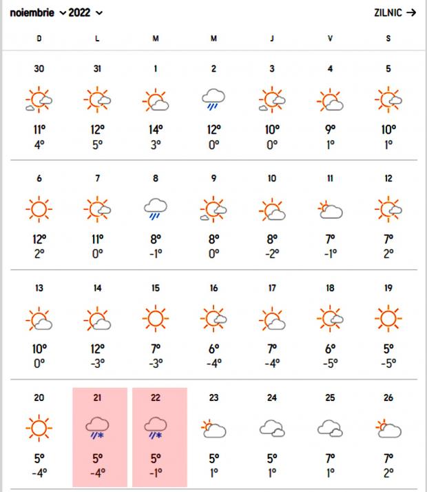 Apoi, în primele săptămâni din luna noiembrie, temperaturile vor continua să fie scăzute. Limitele vor ajunge la cel mult 14 grade pe timpul zilei, iar noaptea temperaturile din termometre vor scădea radical, ajungând chiar și la -5 grade Celsius.