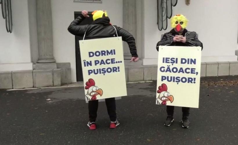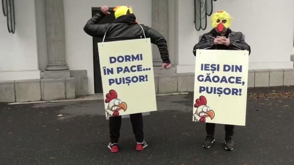 Doi bărbați, cu măști de pui pe față au defilat alături de pancarte, cu mesaje acide.