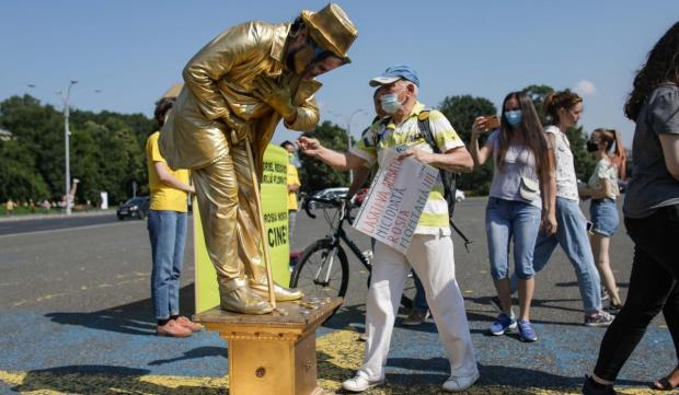 După discurs, o activistă a împărțit banuți de ciocolată înveliți în poleială aurie, simbolizând aurul de la Roșia Montană.