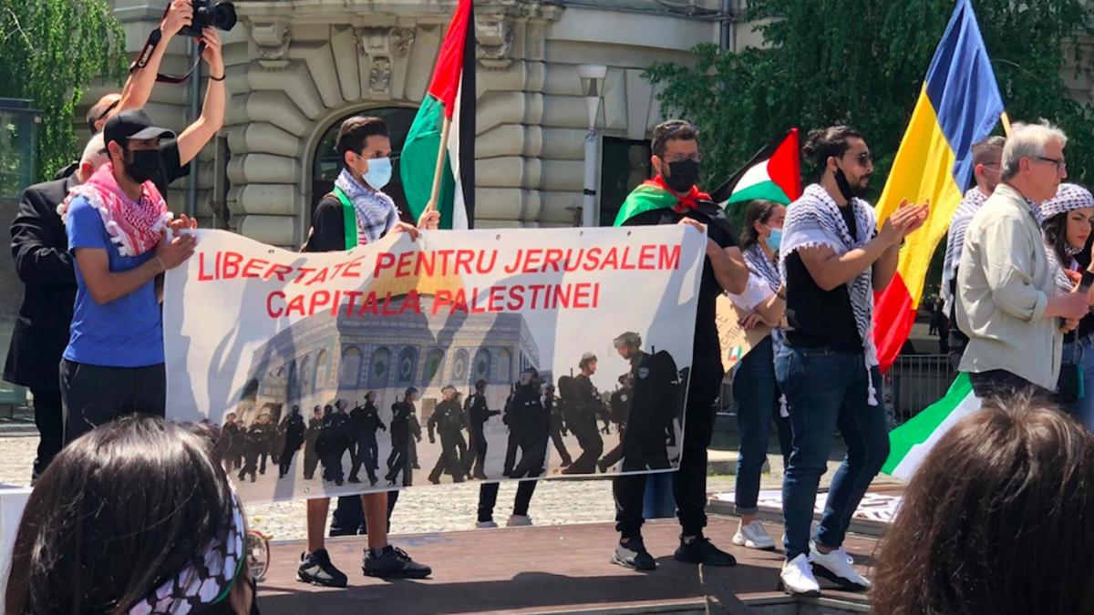 Protestatarii au pancarte pe care scrie "Libertate pentru Jerusalem, capitala Palestinei" și scandeaza "Palestina liberă!"