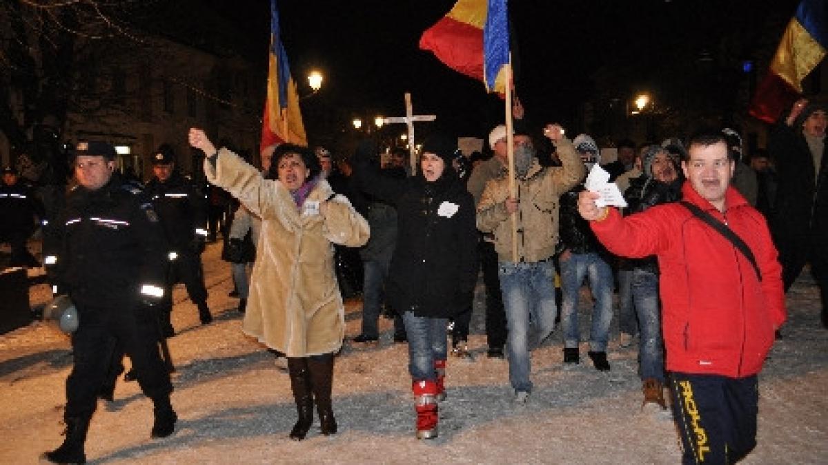 Protestul a început, la ora 17.00, în faţa Prefecturii Bistriţa-Năsăud, unde manifestanţii au afişat pancarte pe care au scris: "Băse, Băse, nici nu ştii, cât de mic începi să fii!", "Udrea, Ritzi, Anastase, nesimţite, mincinoase!", "Băse, Boc şi cu Turcan, să-i dăm jos de la ciolan!", "Ticăloasa guvernare şi-a propus să ne omoare!", dar şi numeroase articole din Constituţie.