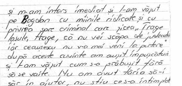 „Ne-am întors imediat și l-am văzut pe Bogdan cu mâinile ridicate și cu privirea spre criminal, care zicea: Trage, lașule! După aceste cuvinte, am auzit împușcătura și l-am văzut cum s-a prăbușit fără să se vaite”.