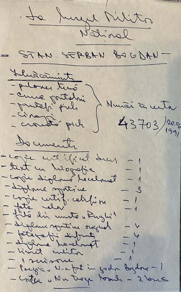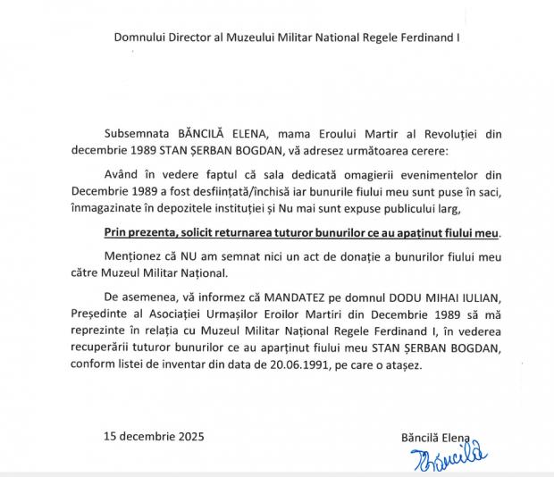 „Prin prezenta, vă transmitem cererea doamnei Băncilă Elena, mama Eroului Stan Șerban Bogdan, de a intra in posesia bunurilor fiului aflate la Muzeul Militar National. Atașăm: Cerere Lista bunurilor - nr 43703/20.06.1991. Așteptăm un răspuns din partea dumneavoastră cu privire la restituirea bunurilor”, se arată în solicitare.