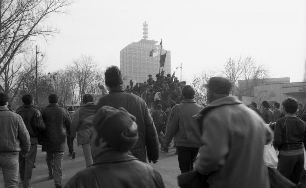 Oameni adunați lângă Televizunea Română, decembrie 1989. Sursa: Agerpres