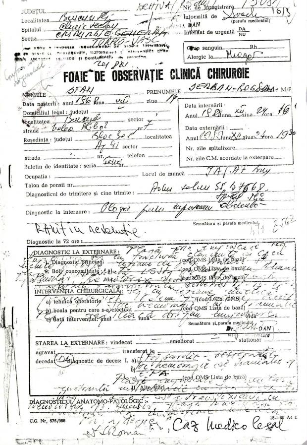Foaie chirurgicală a lui Șerban Bogdan. Document obținut prin amabilitatea Elenei Băncilă