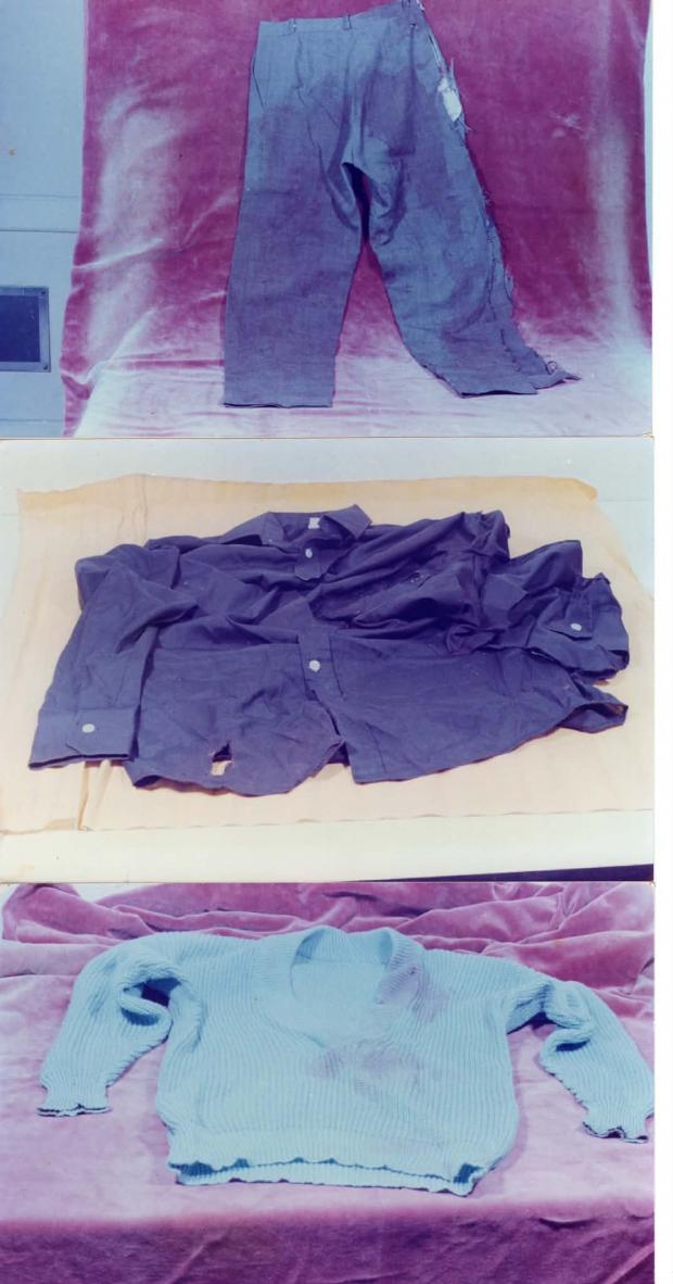 Puloverul albastru, cu pete de sânge (al treilea de jos) și alte haine ale lui Bogdan Șerban. Fotografie din arhiva personală a Elenei Băncilă