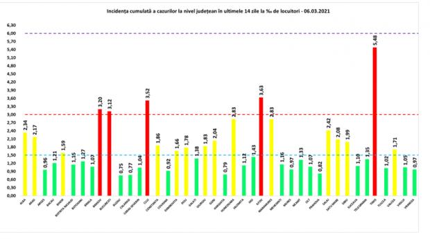 În zona „roşie” au rămas și judeţulele Timiş cu o incidenţă de 5,48 cazuri de infectări cu SARS-CoV-2 la mia de locuitori, Brașov - 3,20, Cluj - 3,52 și Ilfov - 3,63.