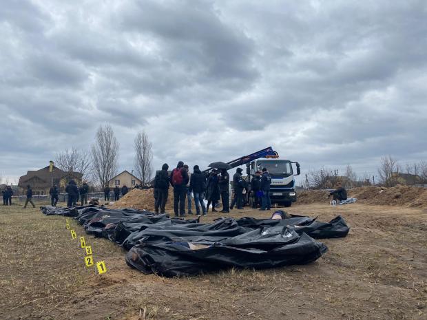 Sute de morți au fost adunați de pe străzi din Bucha în ultima săptămână. Alții au fost descoperiți îngropați în gropi comune.