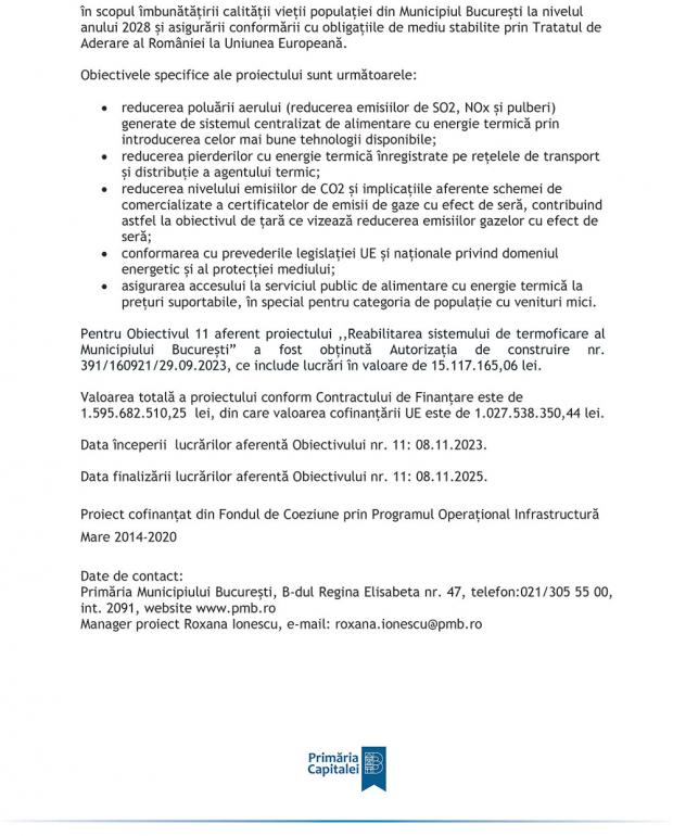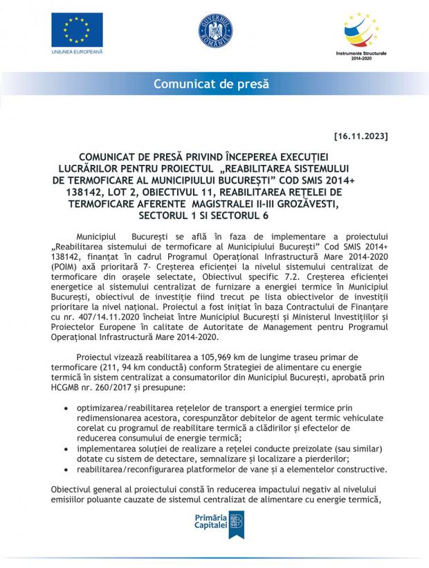 (P) Comunicat de presă privind începerea execuției lucrărilor pentru proiectul "Reabilitarea sistemului de termoficare al municipiului București", cod SMIS 2014+ 138142, lot 2, obiectivul 11, Sectoarele 1 și 6