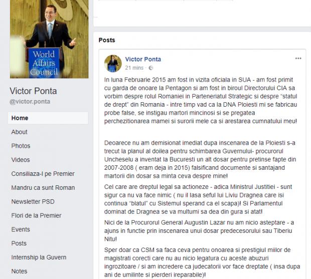 "În luna Februarie 2015 am fost in vizita oficiala in SUA - am fost primit cu garda de onoare la Pentagon si am fost in biroul Directorului CIA sa vorbim despre rolul Romaniei in Parteneriatul Strategic si despre “statul de drept” din Romania - intre timp vad ca la DNA Ploiesti mi se fabricau probe false, se instigau martori mincinosi si se pregatea perchezitionarea mamei si surorii mele ca si arestarea cumnatului meu!