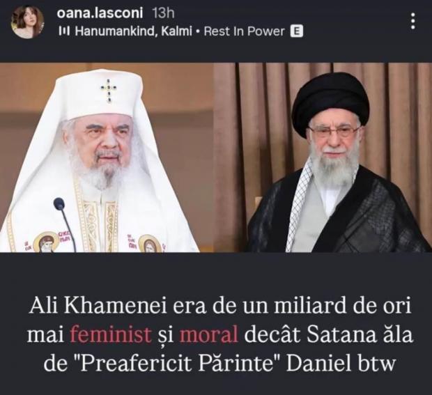 „Ali Khamenei era de un miliard de ori mai feminist și moral decât Satana ăla de ”Prefericit Părinte” Daniel”, a scris Oana Lasconi pe Instagram despre liderul suprem al Iranului, ucis în urma unei operațiuni militare a SUA, care a fost unul dintre cei mai cruzi lideri din istoria modernă.