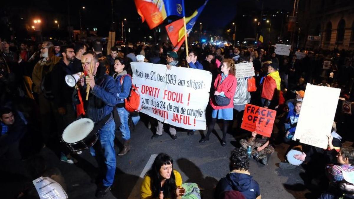 În majoritate tineri, protestatarii adunaţi miercuri seară la Universitate au scandat: "Uniţi, salvăm toată România", "Nu corporaţia face legislaţia", "Rezist, rezist, gazelor de şist", "Demisia" şi "Ultima soluţie, înc-o revoluţie".