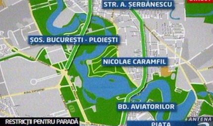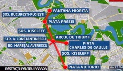 - între orele 09.30 şi 13.00, traficul rutier va fi închis total pe şoseaua Kiseleff, între Piaţa Presei, Arcul de Triumf şi Piaţa Victoriei, pe strada Alexandru Constantinescu între Arcul de Triumf şi bulevardul Mărăşti, pe bulevardul Mareşal Averescu, între Arcul de Triumf şi bulevardul Mărăşti şi pe bulevardul General Constantin Prezan între Arcul de Triumf şi Piaţa Charles de Gaulle.