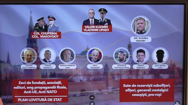 „Sub pulpana Ambasadei Rusiei la București, sub coordonarea atașaților militari, care sunt ofițeri GRU, vă arătăm filiera care a acționat și care e scoasă acum la suprafață. Cei doi ambasadori ruși la București, fostul ambasador Valeri Kuzmin, care e cunoscut pentru activitate anti-românească profundă și îndelungată, și noul ambasador, Vladimir Lipaev. Fostul atașat militar, colonelul Makovskiy, care acum este la Moscova, și actualul atașat militar, colonelul Chuprina, care a fost declarat persona non grata și mâine va trebui să plece în Rusia, adjunctul atașatului militar maiorul Evgheni Ignatiev, pe care oamenii din rețeaua lui Călin Georgescu îl căutau insistent la telefon.