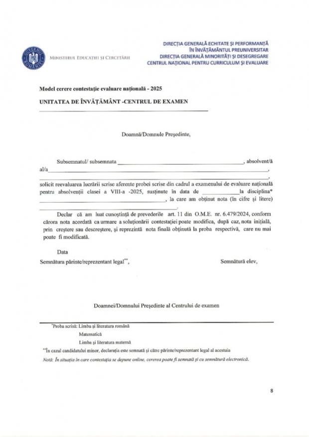 Candidații care depun/transmit contestații completează și semnează o declarație-tip în care se menționează faptul că au luat cunoștință de faptul că nota acordată ca urmare a soluționării contestației poate modifica, după caz, nota inițială, prin creștere sau descreștere (conform prevederilor art. 11 alin. (4) din O.M.E. nr. 6479/2024 privind organizarea și desfășurarea evaluării naționale pentru absolvenții clasei a VIII-a în anul școlar 2024-2025).