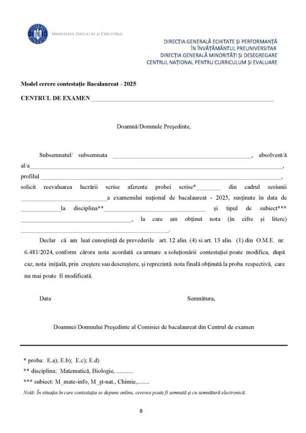 Cererea de contestație Bacalaureat 2025 – formular tipizat poate fi descărcată de mai jos şi, ulterior, printată şi completată: