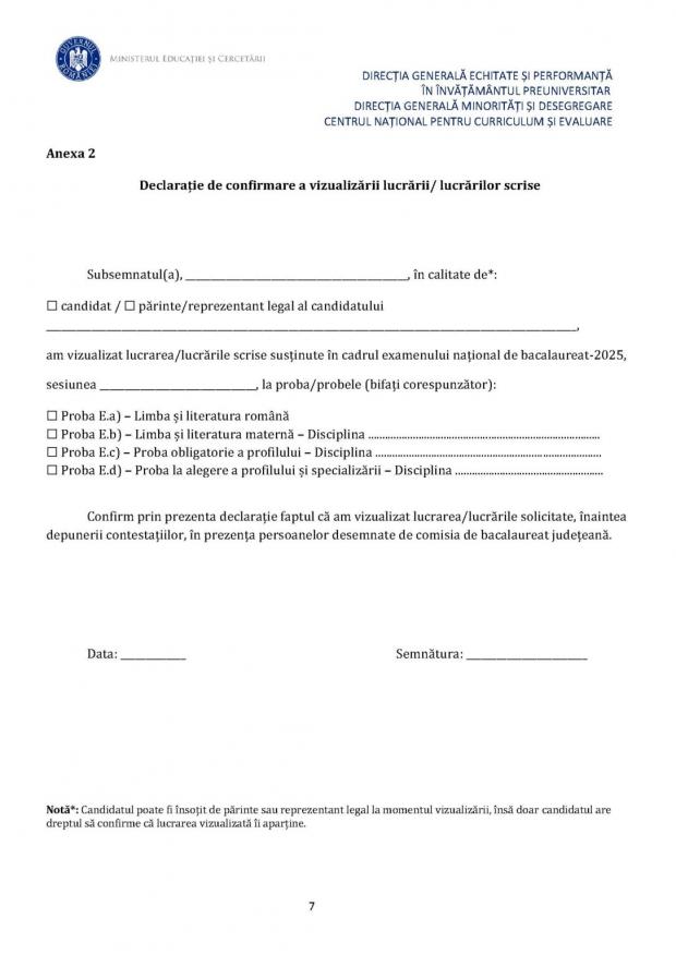 Declarație de confirmare a vizualizării lucrării/ lucrărilor scrise Bacalaureat 2025 – MEC 2025. Sursa document: www.edupedu.ro