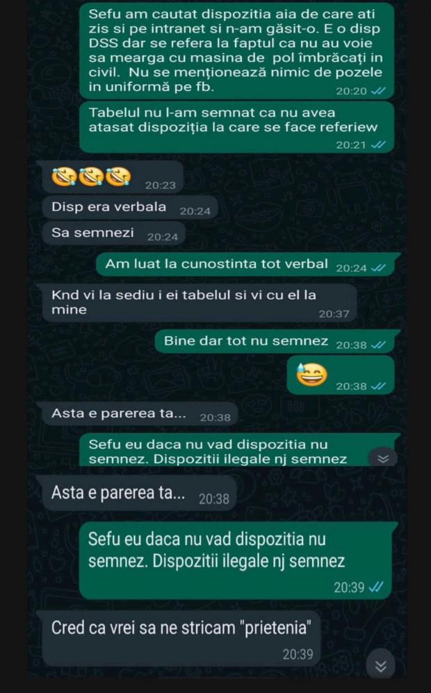 I-am dat șefului un mesaj pe whatsapp și i-am spus că nu există o asemenea dispoziție, iar tabelul nu l-am semnat pentru că nu are anexată la el dispoziția la care se face referire.