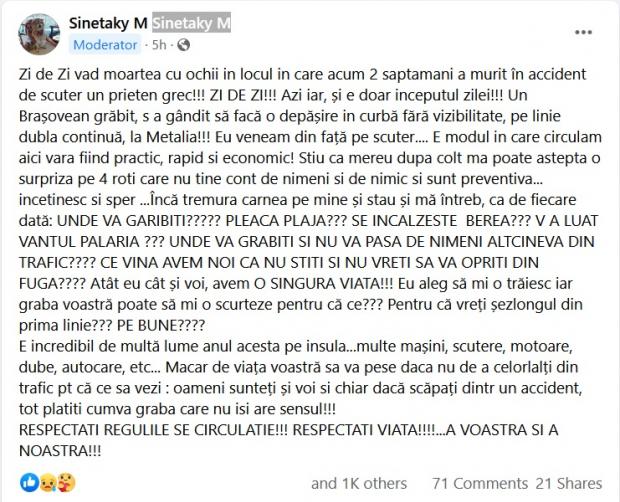 "Zi de zi văd moartea cu ochii în locul în care acum 2 săptămâni a murit în accident de scuter un prieten grec!!! ZI DE ZI!!! Azi iar, și e doar începutul zilei!!! Un brașovean grăbit, s-a gândit să facă o depășire în curbă fără vizibilitate, pe linie dubla continuă, la Metalia!!!