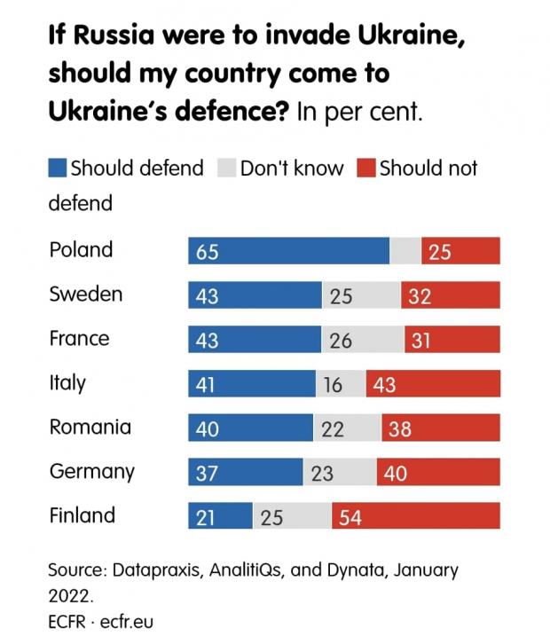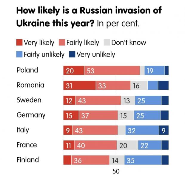 Cei mai convinși că anul acesta Rusia va invada Ucraina sunt polonezii, cu un procent de 74%, urmați de români, cu 64%. De altfel, cu excepția finlandezilor, majoritatea cetățenilor cred chestionați că o invazie este probabilă și foarte probabilă: Suedia - 54%, Germania - 52%, Italia - 52%, Franța - 51%, Finlanda - 44%.