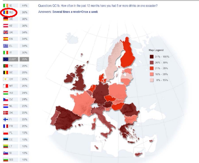 În document se mai arată că persoanele cu vârste cuprinse între 15 şi 24 de ani sunt cele care consumă cel mai mult băuturi alcoolice. În medie, 29 % din cei care trăiesc în ţările Uniunii Europene consumă alcool în exces.