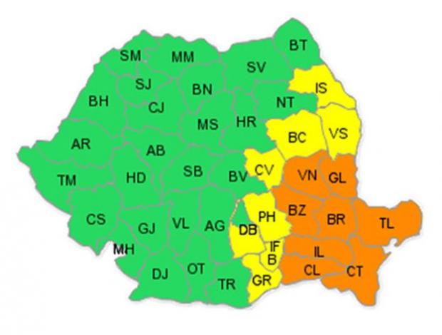 Avertizarea cod portocaliu va fi restrânsă, de miercuri noapte, la opt din cele 14 judeţe, respectiv Călăraşi, Ialomiţa, Constanţa, Tulcea, Brăila, Buzău, Vrancea şi Galaţi.