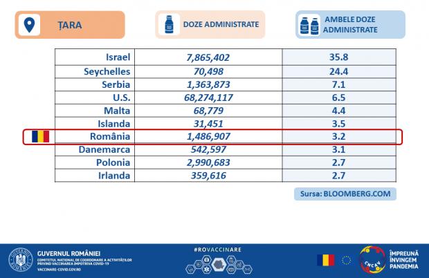 De asemenea, România este pe locul 2 în Europa în ceea ce privește persoanele vaccinate cu ambele doze.