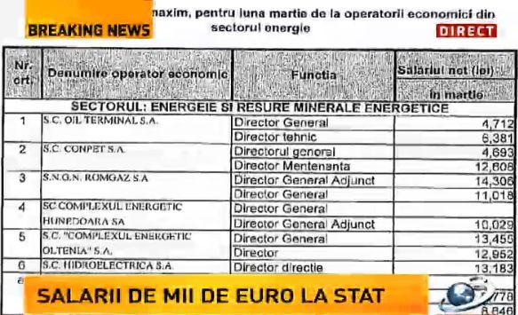 Guvernul a prezentat public lista salariilor nete la nivel maxim, pentru luna martie, ale directorilor din companiile de stat din sectorul energetic, în care sunt indicate remuneraţii ce ajung până la 4.693 lei şi 18.000 lei.