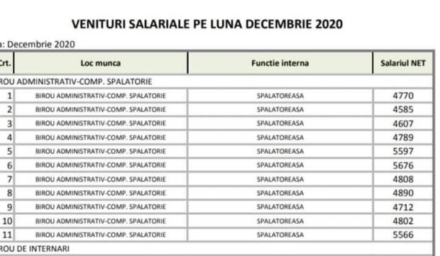 La Spitalul Judeţean de Urgenţă din Târgu Jiu, spălătoresele şi moaşele au salarii uriaşe, în comparaţie cu salariul mediu din România, care este aproximativ 3.400 de lei. Astfel, cele 11 spălătorese aflate pe ştatul de plată al spitalului câştigă între 4.770 de lei şi 5.676 de lei, diferenţele constând în vechimea fiecărei angajate.