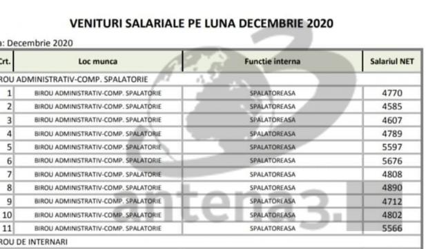 În luna decembrie, angajaţii Spitalului Judeţean de Urgenţă Târgiu Jiu au primit salarii mai mari ca în restul anului, a explicat pentru Antena3.ro Dumitru Vienescu, managerul unităţii. Astfel, spălătoresele au câştigat între 4.770 de lei şi 5.676 de lei, diferenţele constând în vechimea fiecărei angajate, iar moaşele au avut un venit între 7.644 şi 24.202 de lei.
