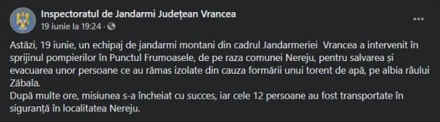 ”Astăzi, 19 iunie, un echipaj de jandarmi montani din cadrul Jandarmeriei Vrancea a intervenit în sprijinul pompierilor în Punctul Frumoasele, de pe raza comunei Nereju, pentru salvarea și evacuarea unor persoane ce au rămas izolate din cauza formării unui torent de apă, pe albia râului Zăbala.