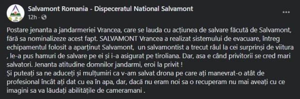 ”Postare jenanta a jandarmeriei Vrancea, care se lauda cu acțiunea de salvare făcută de Salvamont, fără sa nominalizeze acest fapt. SALVAMONT Vrancea a realizat sistemul de evacuare, întreg echipamentul folosit a aparținut Salvamont, un salvamontist a trecut râul la cei surprinși de viitura, le-a pus hamuri de salvare pe ei și i-a asigurat pe tiroliană. Dar, așa e când privitorii se cred mari salvatori. Jenanta atitudine domnilor jandarmi, eroi la privit!