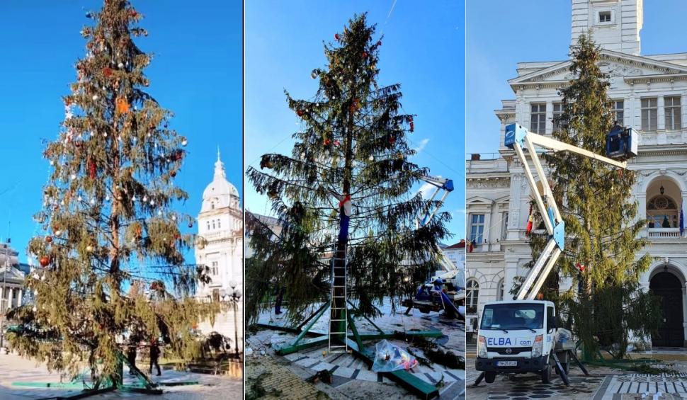 Bradul instalat in fața Primariei Arad a fost ținta glumelor, timp de 5 zile: "Restul din brad când îl vor pune?"