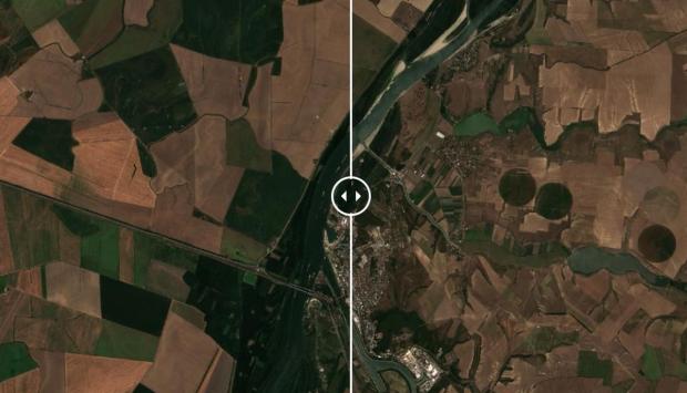 Imaginile surprinse de unul din sateliții din programul Copernicus al Uniunii Europene arată cum s-a micşorat suprafaţa acoperită de apă faţă de anul trecut.