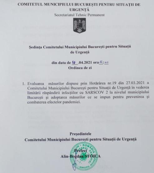Redăm mai jos conținutul hotărârii Comitetului Municipiului București pentru Situații de Urgență: