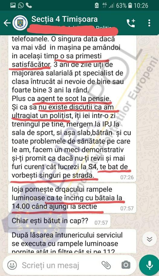 "Efectiv am rămas consternați când am intrat în posesia acestor capturi din grupul de Whatsapp al Secției 4 Poliție și ne întrebăm, cu groază, în ce mod li se adresează oare în particular polițiștilor, dacă pe un grup are un asemenea tupeu de golan. Un asemenea limbaj trivial și această atitudine de interlop nu au ce căuta în Poliția Română. Iar superiorii care l-au tolerat pe acest individ ar trebui să plece la pachet cu el. Am sesizat de mai multe ori conducerea IGPR cu privire la abuzurile care se comit în IPJ Timiș, iar lipsa de reacție și implicit lipsa unor sancțiuni au încurajat șefii să-și conducă oamenii prin teroare și dispreț", au mai scris reprezentanţii Europol pe Facebook.