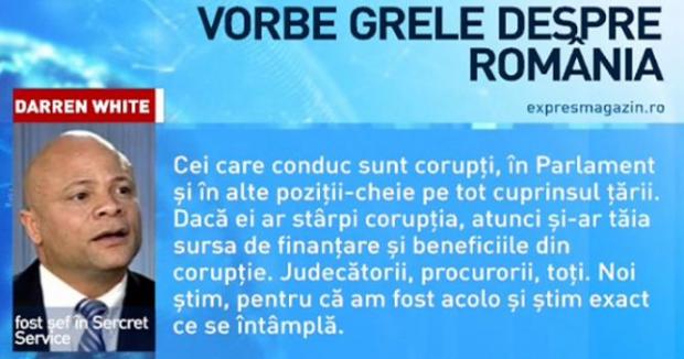 „Cei care conduc sunt corupţi, în Parlament şi în alte poziţii-cheie pe tot cuprinsul ţării. Dacă ei ar stârpi corupţia, atunci şi-ar tăia sursa de finanţare şi beneficiile din corupţie. Judecătorii, procurorii, toţi. Noi ştim, pentru că am fost acolo şi ştim exact ce se întâmplă. De ce judecătorii, procurorii, parlamentarii şi liderii României şi-ar tăia sursa de finanţare? Sunt concentraţi să pună mâna pe orice pot. Mergi la Parlament, 85% din Parlament e corupt, toţi iau mită. O ştiu şi ei, se supără când eu vorbesc despre asta, a declarat Darren White.