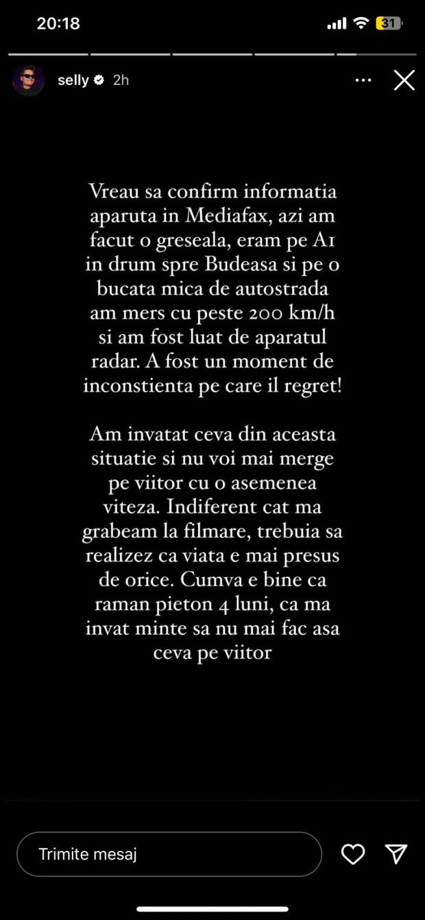 Cumva e bine că rămân pieton patru luni, că mă învăț minte să nu mai fac așa ceva pe viitor", a scris Selly pe Insta Story.