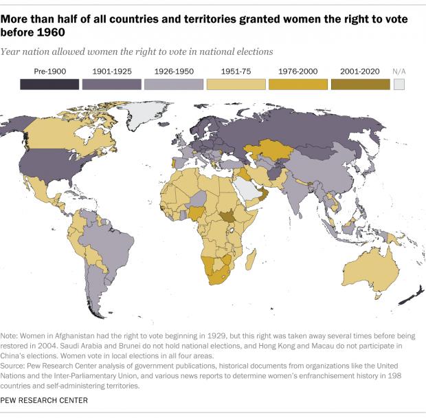 Sacrificiile lor au dat rezultate. Dacă la începutul secolului XX, doar 20 de țări acordau drept de vot femeilor, până în 1960 peste jumătate din țările și regiunile autonome din lume, 129 din 198, au dat drept de vot și cetățenelor, potrivit unei cercetări a Pew Research Center. În prezent, niciun stat sau regiune autonomă nu interzice femeilor să voteze din cauza genului lor, însă există țări în care nu au loc alegeri sau alegerile sunt un simulacru, astfel că votul este golit de conținut.