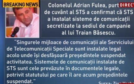 Vă prezentăm şi comunicatul prin care Colonelul Adrian Fulea confirmă că STS a instalat sisteme de comunicaţii secretizate la sediul de campanie al lui Traian Băsescu.