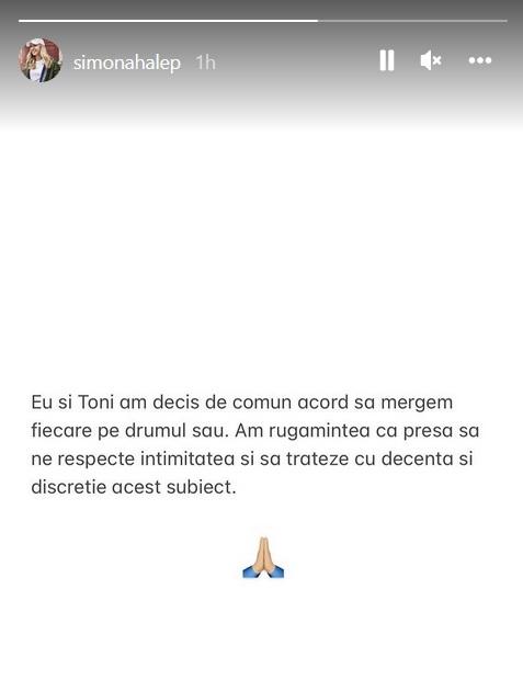 „Eu şi Toni am decis de comun acord să mergem fiecare pe drumul său. Am rugămintea ca presa să ne respecte intimitatea şi să trateze cu decenţă şi discreţie acest subiect”, a scris Simona Halep pe Instagram.