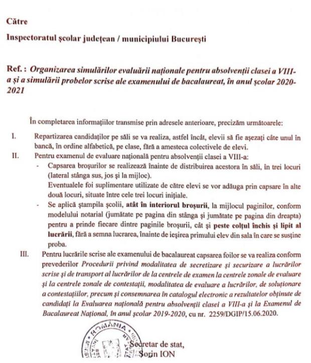 „Repartizarea candidaților pe săli se va realiza astfel încât elevii să fie așezați câte unul în bancă, în ordine alfabetică, pe clase, fără a amesteca colectivele de elevi”.